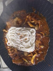 フューチャーフォックスのマルチグラドルで、ホルモンの脂と旨辛ダレをうどんにしっかり吸わせていきます。