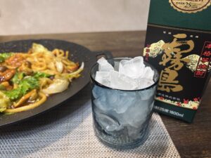 完成した熱々のホルモンうどんを、キンキンに冷えた黒霧島ロックで迎え撃ちます。